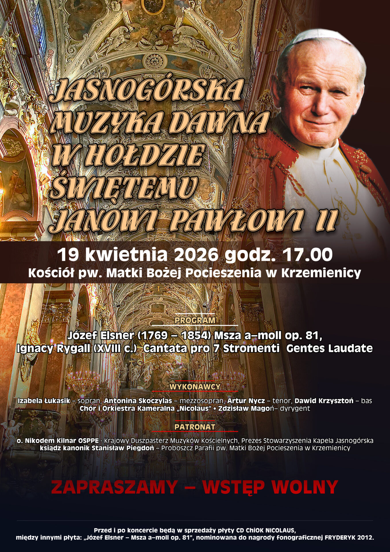 19 kwietnia 2026 r. serdecznie zapraszamy wszystkich Parafian oraz Gości na wyjątkowy koncert, który odbędzie się o godz. 17:00 w naszej świątyni.